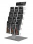 Stabilny, składany prezenter na ulotki, foldery. Stojak posiada składany statyw z anodowanego aluminium oraz sześć kaskadowo ułożonych kieszonek z plexi, formatu A4 w poziomie, z możliwością podziału na ulotki A5 i Dl, dodatkowo toper formatu DL w górnej części stojaka.